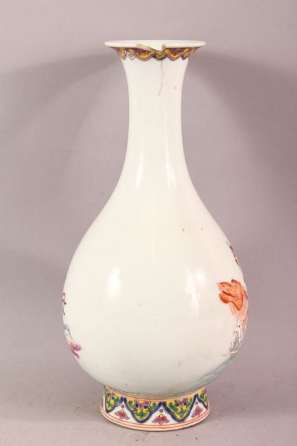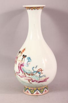 A CHINESE FAMILLE ROSE IMMORTAL PORCELAIN VASE - decorated with scenes of immortal figures amongst waves upon the back of a dragon, the base with a six character mark, 28.5cm