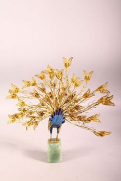 A DECORATIVE GILT METAL AND ENAMELLED MODEL OF A PEACOCK, plumage on full display, mounted on an onyx base, 25cm high.
