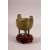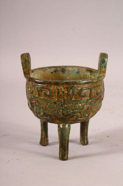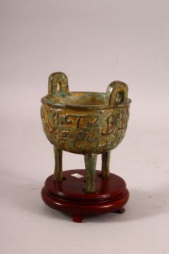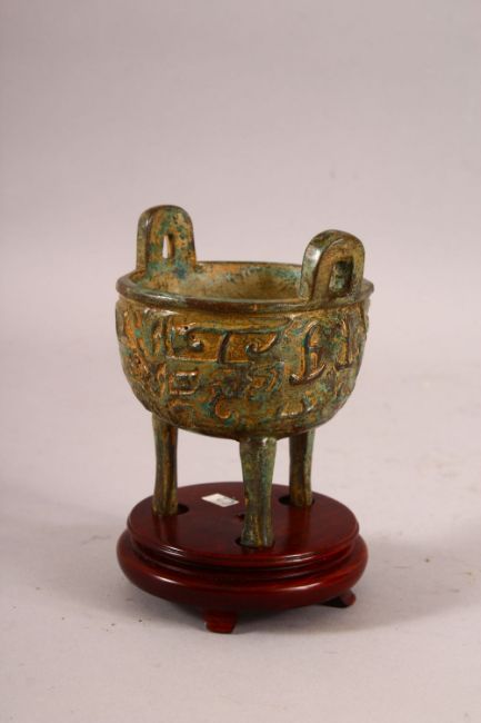 A CHINESE ARCHAIC STYLE TWIN HANDLE CENSER & STAND - with archaic decoration, with wooden stand - 12cm x 10cm