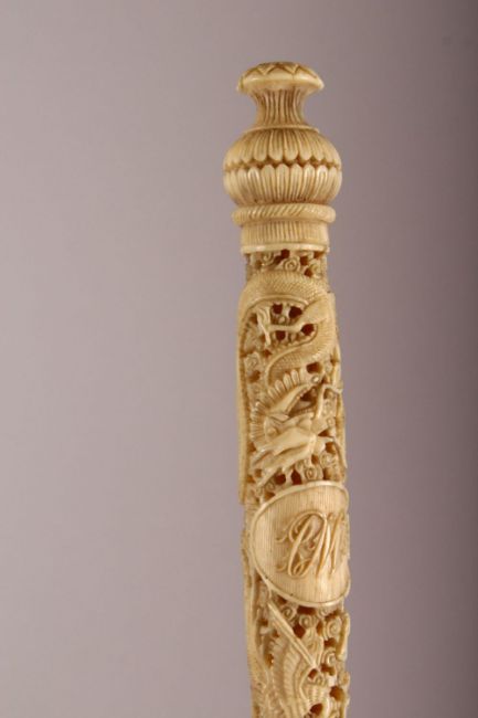 A 19TH CENTURY CHINESE CANTON CARVED IVORY PARASOL HANDLE - carved in deep relief depicting dragons and phoenix birds, with a cartouche carved with initials, 18cm