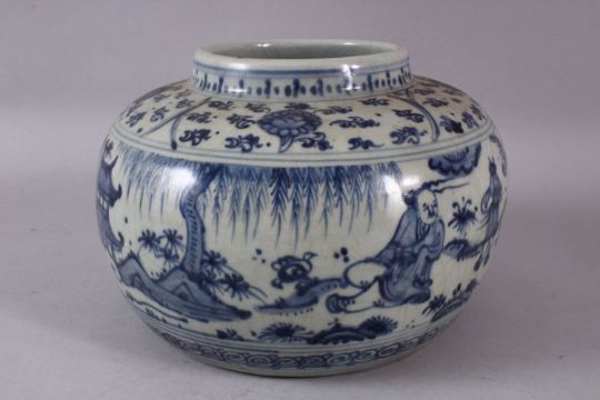 A CHINESE MING STYLE BLUE & WHITE PORCELAIN POT, decorated with scenes of figure in landscapes with floral borders, base with a four character mark, 20cm diameter,
