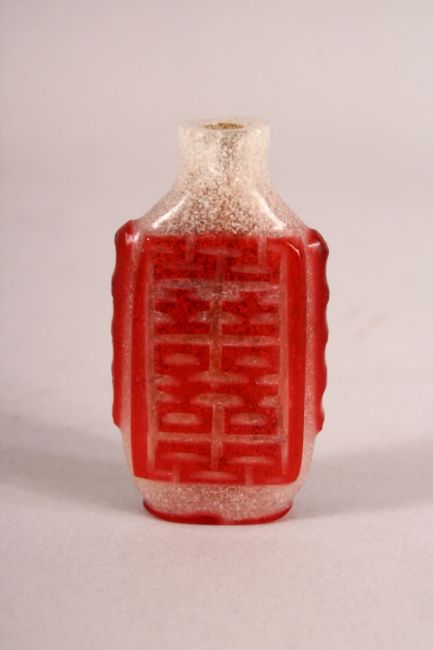 A CHINESE OVERLAY FROSTED GLASS SNUFF BOTTLE - overlaid in red with calligraphy, 6.5cm