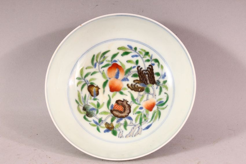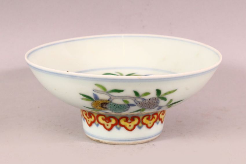 A CHINESE DOUCAI DECORATED PORCELAIN STEM DISH, - decorated with fruits and peach, the base with a six character mark. 14cm