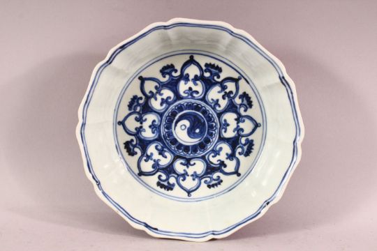 A CHINESE MING STYLE FLAMBE GLAZED BLUE & WHITE PORCELAIN MOULDED DISH - the exterior with a flambe glaze, the interior with yin yang and flora, the base with an incised mark, 19cm
