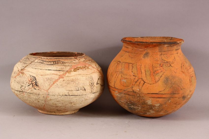 TWO INDUS VALLEY CERAMIC VASES, both painted with animals and stylised motifs, 18.5cm high and 15cm high.