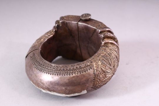 A PERSIAN WHITE METAL SLAVE BANGLE, with engraved and embossed decoration, 12cm wide.