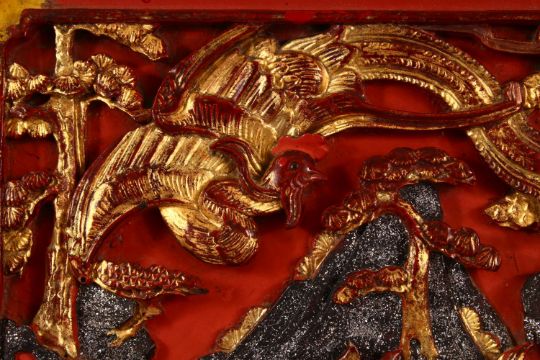 AN UNUSUAL CHINESE LACQUERED CARVED WOOD PANEL, the panel carved with kylin and phoenix, possibly 19th Century but with later work, 32.5cm x 31cm.