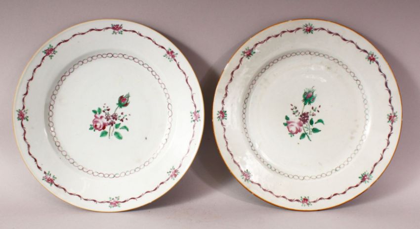 A PAIR OF 18TH CENTURY CHINESE FAMILLE ROSE PLATES - decorated with bands or floral borders with central floral decor, 24cm