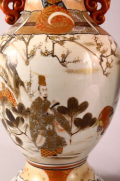 A PAIR OF JAPANESE MEIJI PERIOD KUTANI PORCELAIN VASES - each with twin handles and a flared rim, decorated with scenes of figures in waterside landscapes, 26cm high