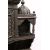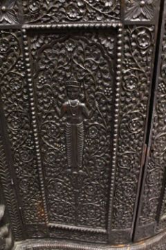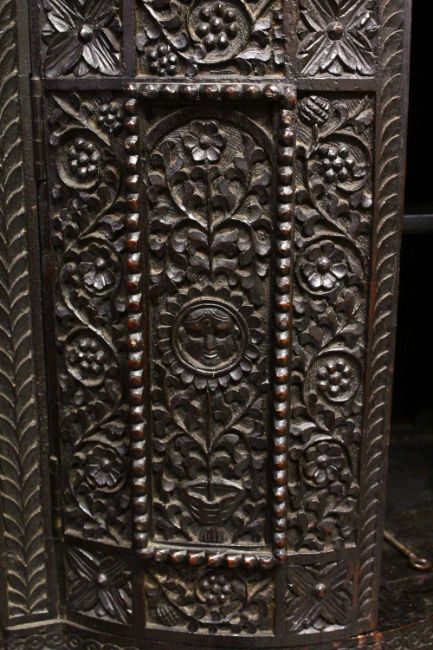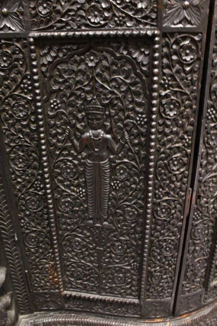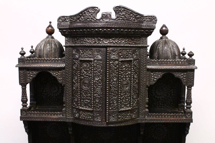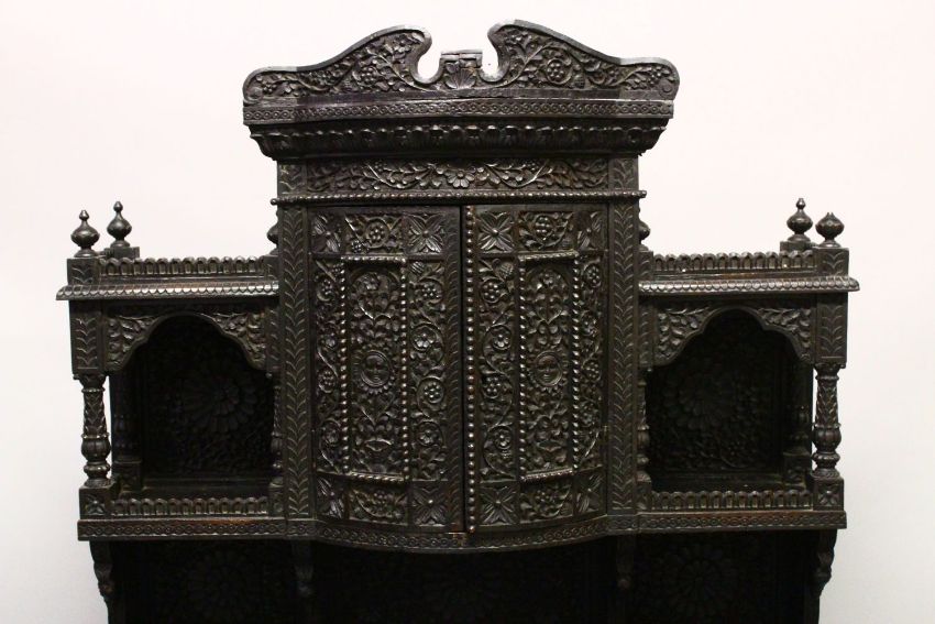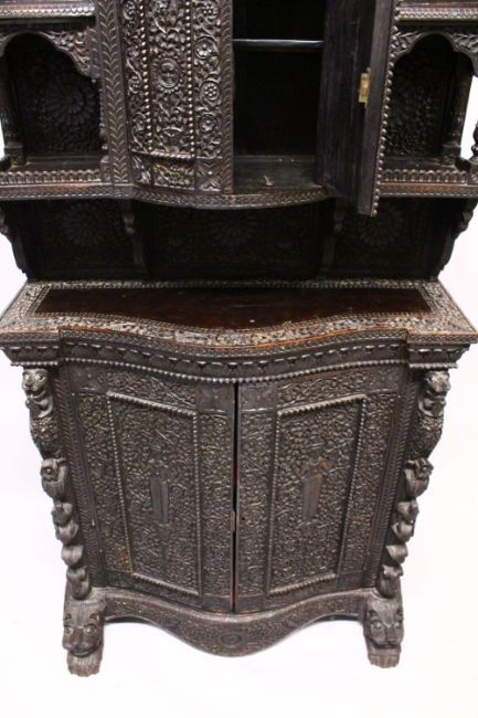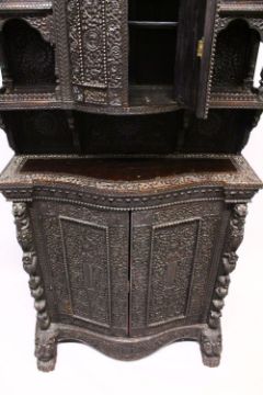 A SUPERB CEYLONESE CARVED EBONY CABINET, with broken arch pediment above a pair of bow fronted doors flanked by open shelves, the serpentine fronted base with a pair of panelled doors, on a pair of carved figural feet, profusely carved all over with figures, animals and foliate decoration, together with two possibly associated carved mihrab finials 175cm high, 92cm wide, 40cm deep.