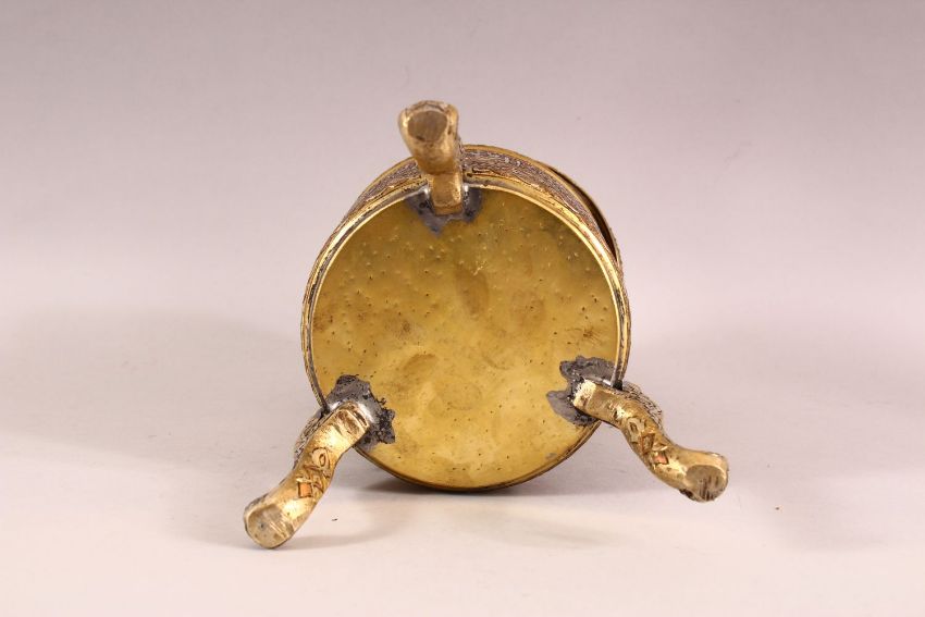 AN ISLAMIC SILVER AND COPPER INLAID BRASS INCENSE BURNER AND COVER, on tripod legs, with roundels and bands of calligraphy, comprising of three pieces, 36cm high.
