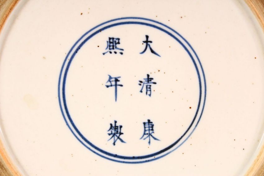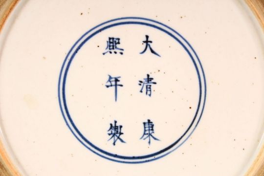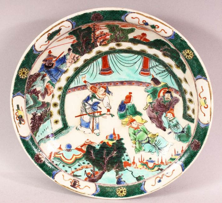 A CHINESE KANGXI STYLE FAMILLE VERTE PORCELAIN DISH - decorated with theatre actors in warrior uniform, the base with a six character mark, 28cm