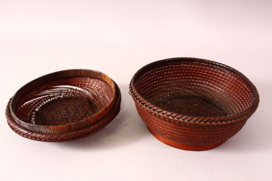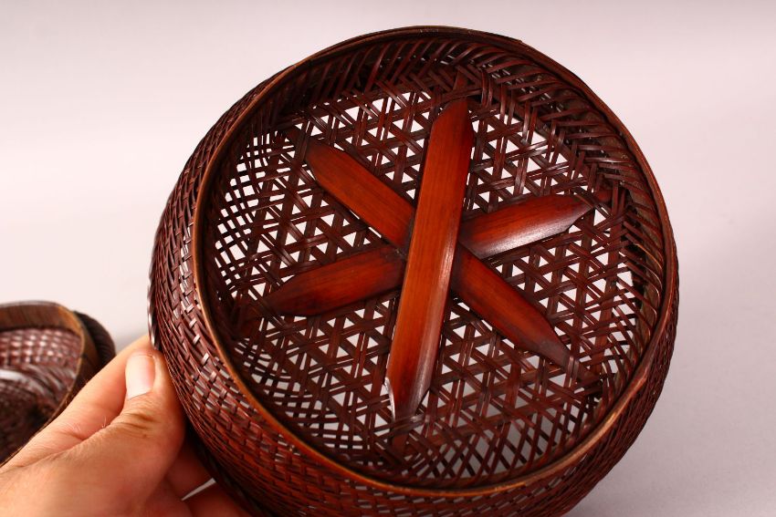 A JAPANESE MEIJI PERIOD WOVEN IKEBANA BASKET & COVER - of woven form with a ring handle, 19.5cm