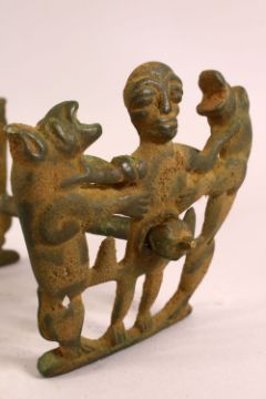 AN UNUSUAL IRON HORSE GRIP/BITE, the pierced ends with a figure and two animals, 25cm long.