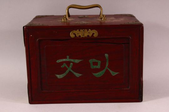 A CHINESE BAMBOO & BONE BOXED MAHJONG SET - comprising 56 drawers full of counters and sticks, the back missing, boxed with metal mounts, 24cm wide x 16cm