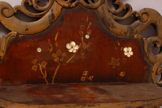 A CARVED WOOD & LACQUER CHINESE WALL SHELF UNIT, with twin folding shelves, the panel decorated with landscape scenes with inlaid ivory and shell, with a seal mark, the carved border gilded, 76cm high