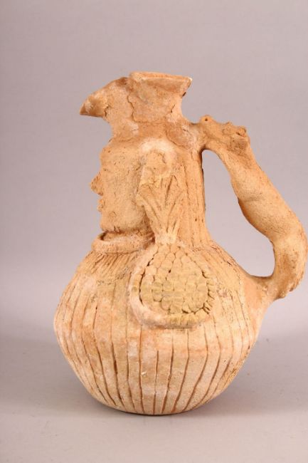 AN UNUSUAL EARLY SELJUK UNGLAZED POTTERY EWER, with the handle moulded as an animal, the ewer with a human face, 26cm high.