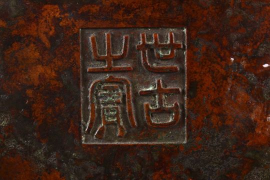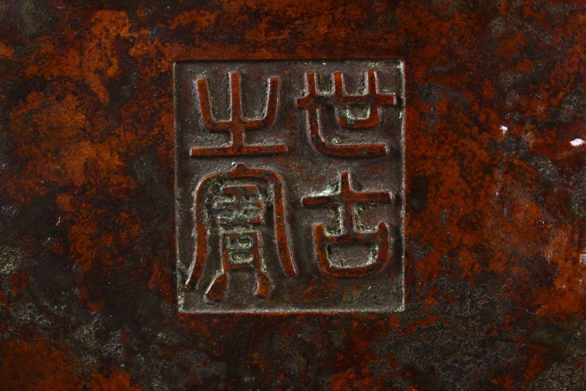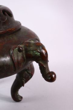 A VERY HEAVY CHINESE BRONZE TWIN ELEPHANT HANDLE INCENSE BURNER & COVER, the burner with twin elephant handles and tripod feet, the cover with openwork recumbent elephant finial, the base with an impressed four character mark, 22cm high 33cm wide,