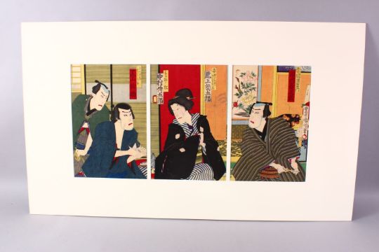 A JAPANESE MEIJI PERIOD WOOD BLOCK PRINT TRIPTYCH - KUNICHIKA TOYOHARA 1835 - 1900 - KABUKI THEATRE PLAY - depicting four actors in play, each signed and sealed, mounted for framing, overall 100cm x 59cm.