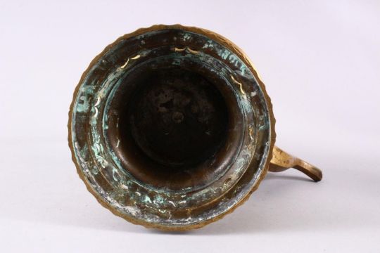 A CHINESE TIBETAN BRASS KETTLE & COVER, of tapered form with panel foliage motif, 26cm high x 24cm