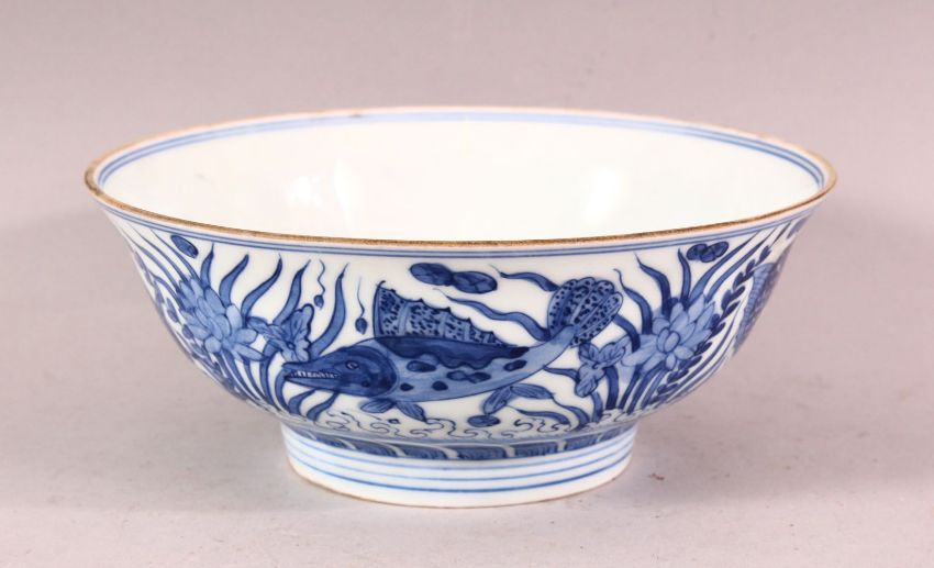 A CHINESE MING STYLE BLUE & WHITE PORCELAIN BOWL - decorated with scenes of fish and reeds, the base with a six character mark, 18cm.