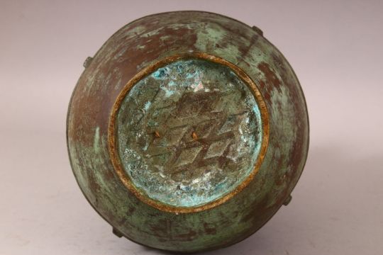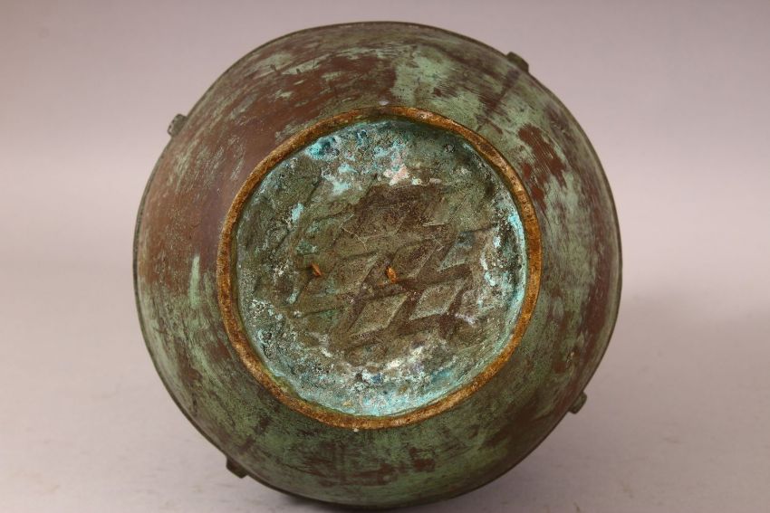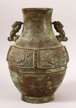 A CHINESE ARCAHIC STYLE BRONZE VASE - decorated with arcahic design with birds & beasts - with twin handles and calligraphy, 26.5cm
