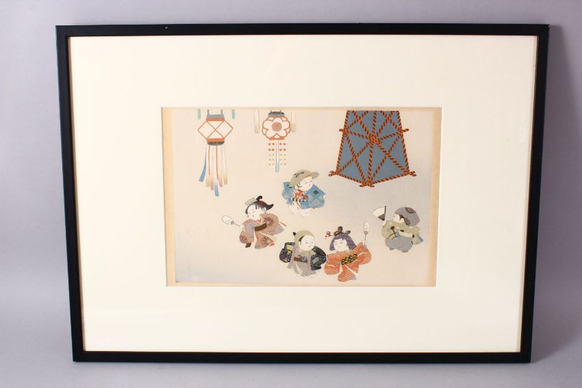 A EARLY 20TH CENTURY JAPANESE WOODBLOCK PRINT - JAPANESE FESTIVAL - depicting 5 actors holding fans, professionally framed 44.5cm high x 61cm wide