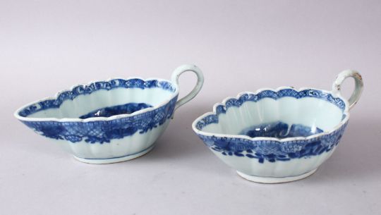 A PAIR OF 18TH CENTURY CHINESE BLUE & WHITE PORCELAIN SAUCE BOATS, each decorated with native landscape scenes, 19cm wide.