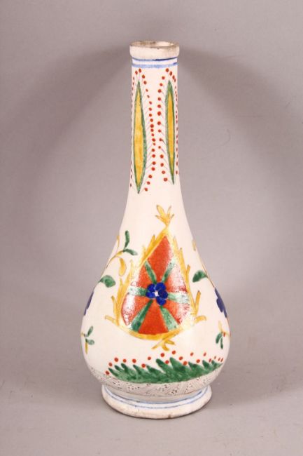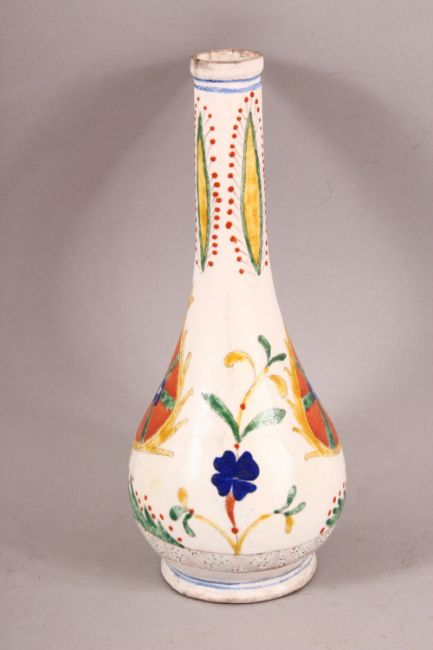 A TURKISH KUTHAYA POTTERY TULIP STEM NECK VASE, with panel floral motifs, 23.5cm