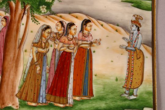 A FINE INDIAN IVORY MINIATURE PAINTING OF KRISHNA AND GOPIES, 15cm x 10.5cm.