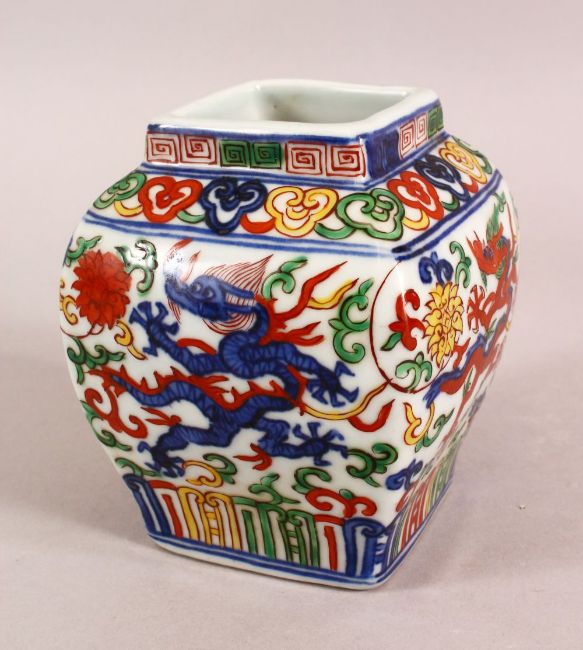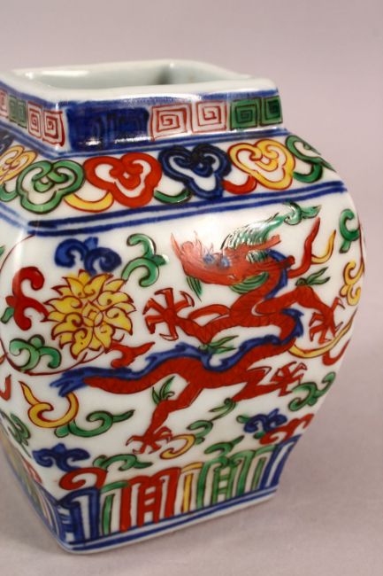 A SMALL CHINESE WUCAI STYLE VASE, the body painted with dragons and flowers, six character mark to base, 10.5cm high.