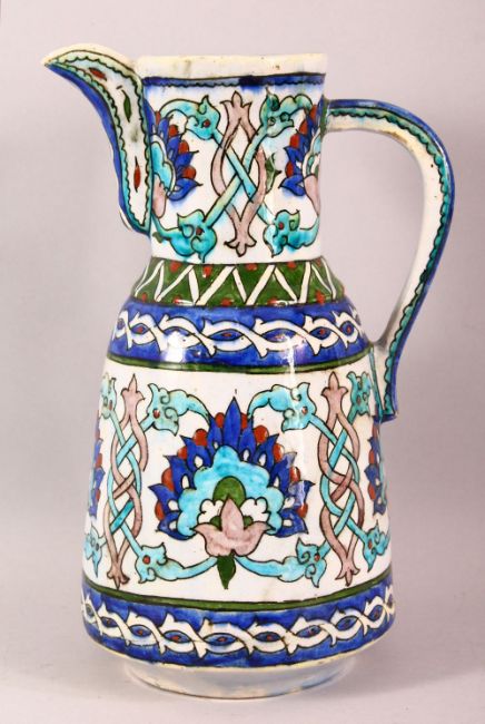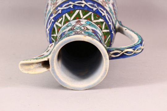 A GOOD IZNIK STYLE POTTERY EWER - finely decorated with colourful floral motifs, Poss 19thc, 27cm high .