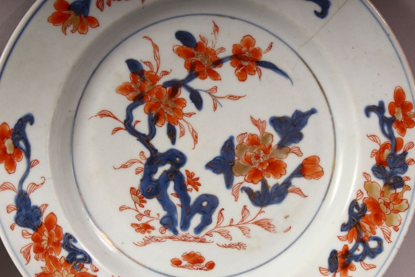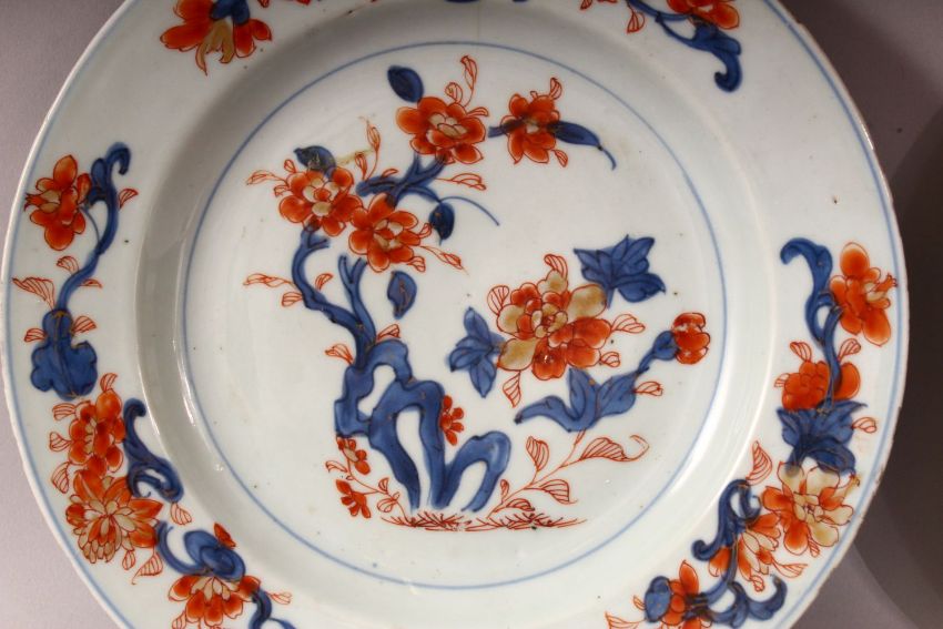 A PAIR OF 18TH CENTURY CHINESE IMARI PORCELAIN PLATES - each decorated with floral display in underglaze blue & iron red - 23cm