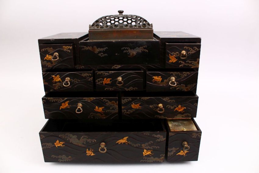 A GOOD JAPANESE MEIJI PERIOD LACQUER CABINET / BOX, The body decorated with raised wave design and gilt birds, the top with koro section, with 9 drawers, 34cm x 37cm.
