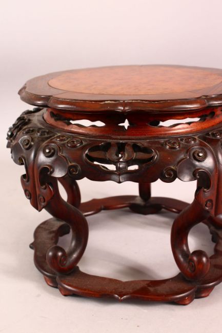 A FINE 19TH CENTURY CHINESE HARDWOOD CARVED STAND - with a burr wood inset top, the body carved with lotus and funghi, 22cm high x 30cm diameter