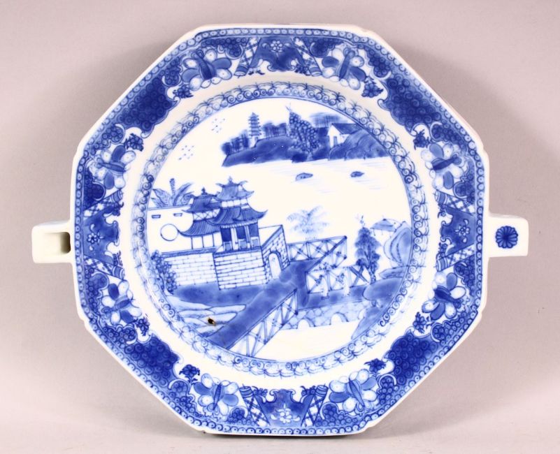 A CHINESE EXPOST BLUE & WHITE PORCELAIN WARMING PLATE - decorated with scenes of native landscapes, 28cm, (AF)