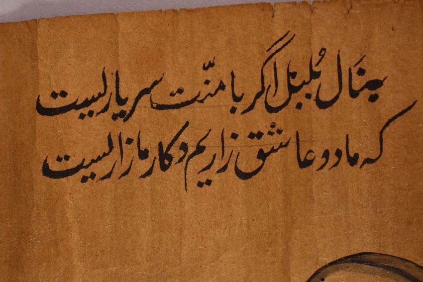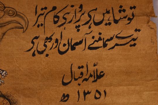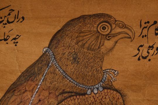 A FINE LARGE INDO PERSIAN INSCRIBED DRAWING OF A FALCON, unframed, 46cm x 38.5cm.