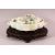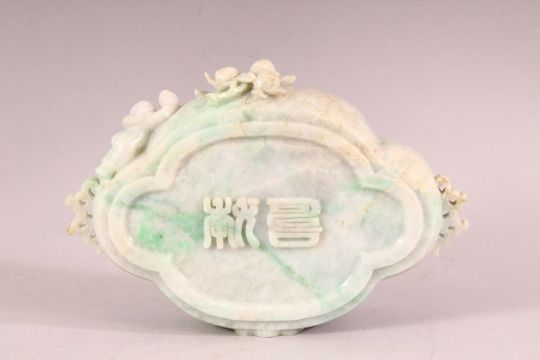 A GOOD CHINESE JADEITE CARVING ON A WOODEN STAND, the bowl formed carving depicting a sage with children amongst peach tree branches, a large relief mark to base, carving 21cm x 14cm, height on stand 11.5cm.