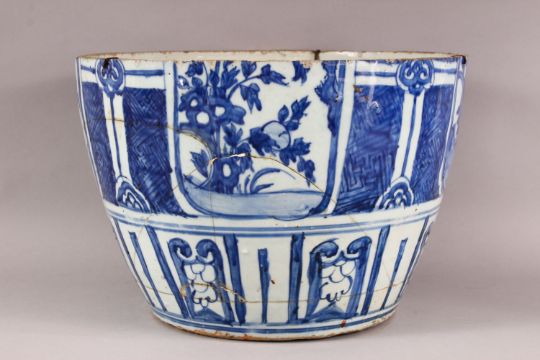 A CHINESE WANLI BLUE & WHITE VASE SECTION, the lower part to a larger jar / vase, with partial landscape views, 33cm