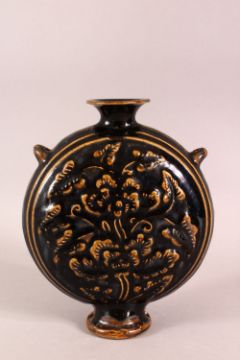 A SMALL JIZHOU KILN POTTERY MOON VASE, 21cm high, 18cm wide.