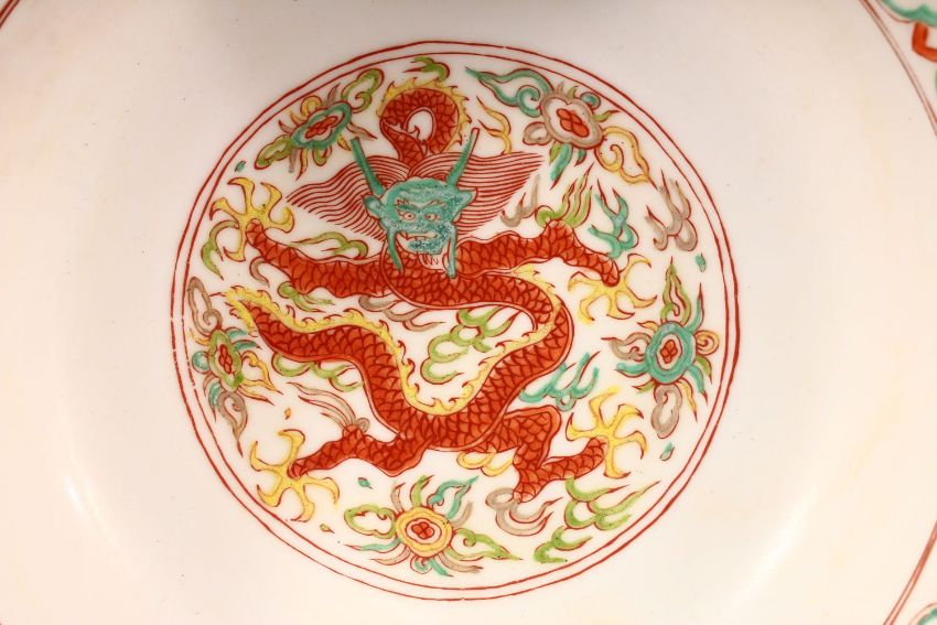A FINE MING STYLE CHINESE WUCAI DECORATED BOWL - decorated with scenes of dragons and phoenix birds, the base with a six character mark, 30cm diameter
