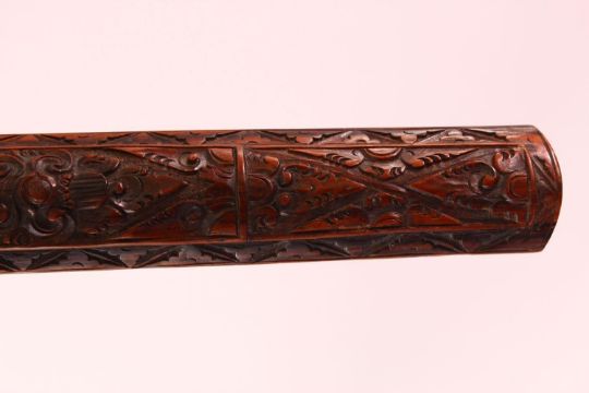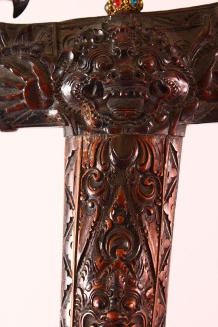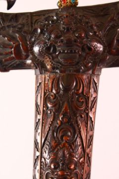 A GOOD INDONESIAN CARVED WOODEN SWORD / DAGGER, the well carved dagger with an elephant carved deity handle, metal inlaid collar, with carved mythical beast sheath, the balde of waved form, 62cm