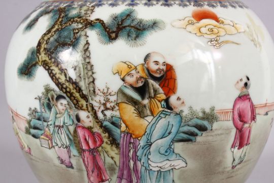 A CHINESE REPUBLIC FAMILLE ROSE PORCELAIN VASE, decorated with immortal figures and children in landscapes amongst stylized clouds, with decoration of butterflies and borders of lappet and flora, the base with a four character iron red seal mark, republic or later 40cm high.