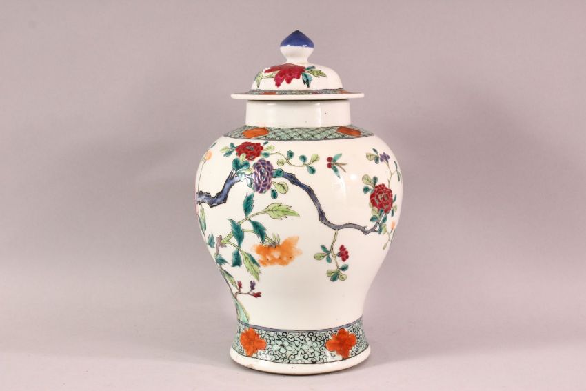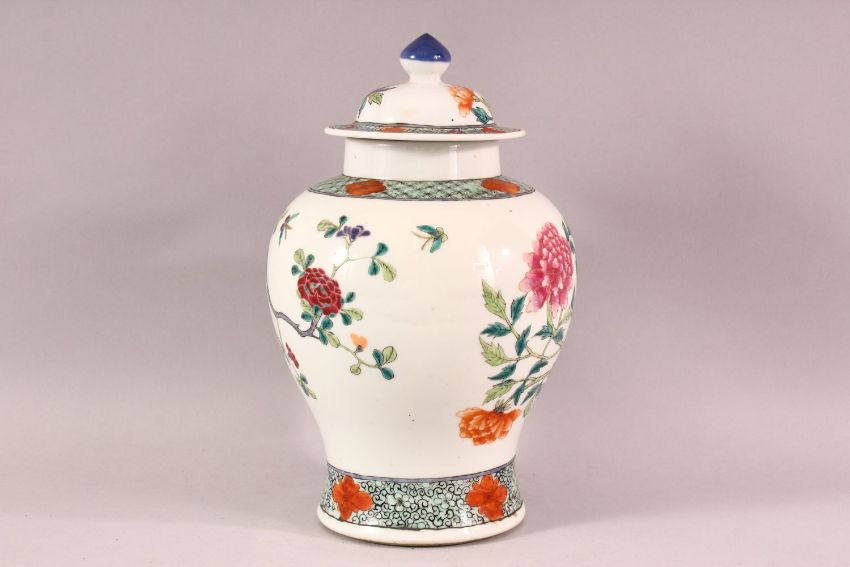 A CHINESE FAMILLE ROSE PORCELAIN JAR & COVER - decorated with scenes of native floral landscape scenes, with its cover, the base with a four character mark, 30cm high.