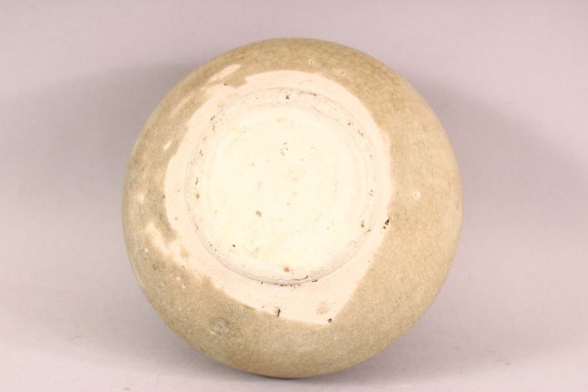 A 15TH CENTURY CHINESE SAWANKHALOK CELADON TWIN HANDLE POTTERY VASE, with carved border decorations, 13cm high x 15cm.