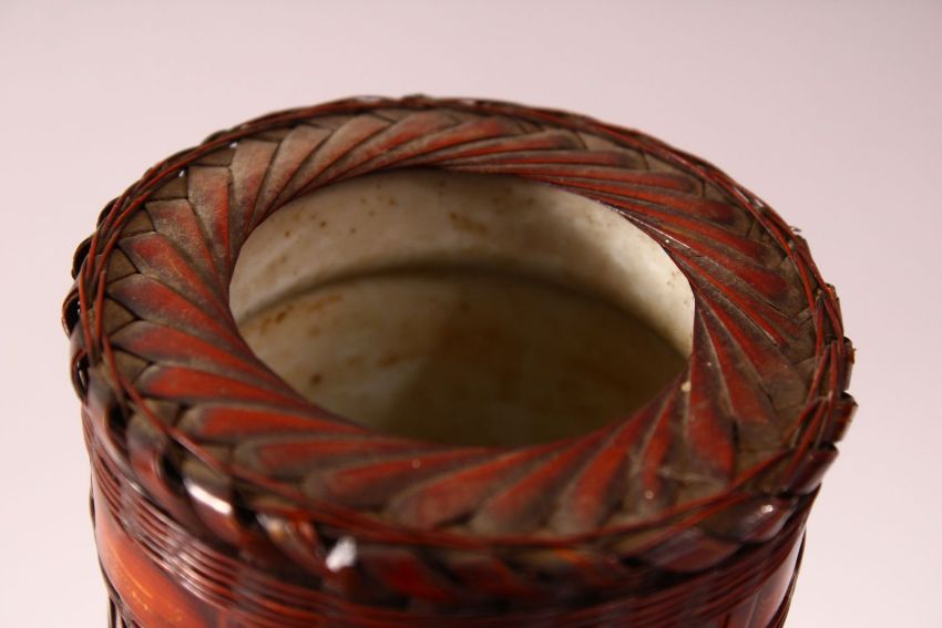 A JAPANESE MEIJI PERIOD WOVEN BOTTLE NECK IKEBANA VASE - with twisted woven pattern, with a porcelain insert, 29cm
