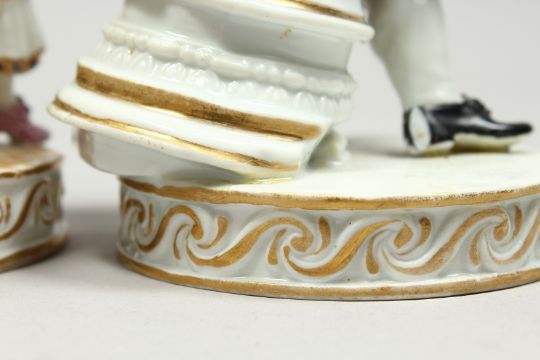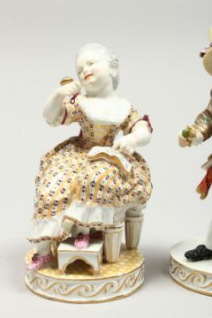 A NEAR PAIR OF MEISSEN PORCELAIN FIGURES OF A YOUNG BOY AND GIRL, the boy in a plumed hat, the girl reading a book.