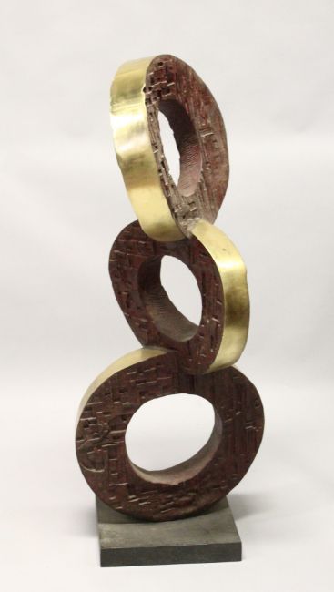 A LARGE POLISHED AND PATTINATED BRONZE ABSTRACT GROUP OF THREE CONJOINED CIRCLES, on a square base.