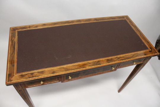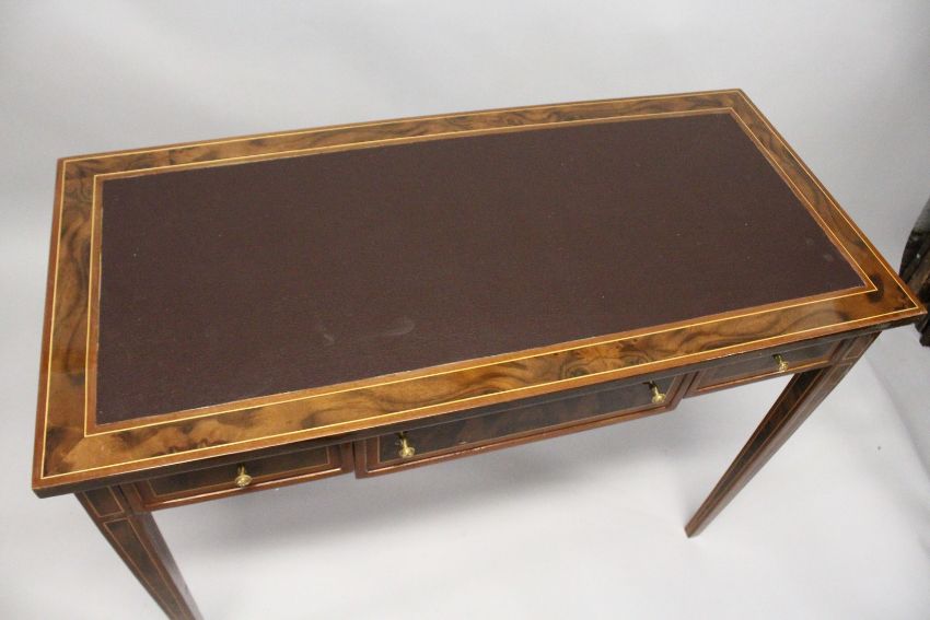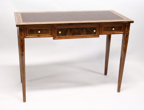 A MAHOGANY WRITING DESK with leather inset top over three drawers on tapering squre legs