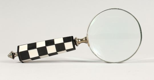 A MAGNIFYING GLASS WITH CHEQUERED HANDLE.